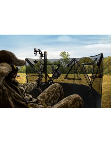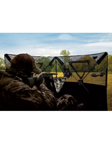 El puesto de caza SurroundView de PRIMOS Hunting está construido con dos exclusivos muros transparentes unidireccionales, por lo que puede ver cada movimiento frente a usted sin tener que moverse para mirar alrededor o por encima. Tres ventanas abatibles están perfectamente ubicadas para múltiples opciones de tiro. Su diseño de dos ejes, mantiene ambas paredes de forma consistente, pero haciéndolo a la vez fácil de levantar o tumbar.