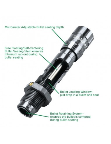 El die posicionador RCBS MatchMaster tiene un acabado excepcional, mecanizado, pulido y acabado en pavón. El die posicionador cuenta con un pomo de ajuste amplio y sobredimensionado, con ajustes de gran tamaño fácilmente legibles y suave de ajustar a la medida deseada. La regulación permite incrementos de .001" de la máxima precisión. Cuenta con una ventana de carga que permite colocar la punta en ella y simplemente accionar la prensa para que coloque la punta en la vaina. Gracias a este sistema de ventana, no es necesario tratar de alinear la punta manualmente o jugarse los dedos en cada operación. La pieza interior del die caza la punta y la sujeta perfectamente alineada con la vaina, guiándola durante el proceso de posicionado para obtener la máxima concentricidad.